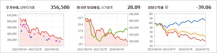 현재 POSCO홀딩스의 주가는 356,500원으로, 전일 대비 6,000원이 하락한 상태입니다. 주주 현황을 살펴보면, BlackRock Fund Advisors를 포함한 13명이 총 10.58%의 지분을 보유하고 있습니다. POSCO홀딩스는 금속 및 광물 분야의 기업으로, 현재 주가는 356,500원입니다. 이 회사의 시가 총액은 26조 5,977억 원이며, 총 발행 주식 수는 82,879,805주입니다. 외국인 보유 비율은 28.09%이며, 장중 거래량은 285,311주에 달했습니다. POSCO홀딩스의 매출액은 180,520억 원으로 보고되었습니다.