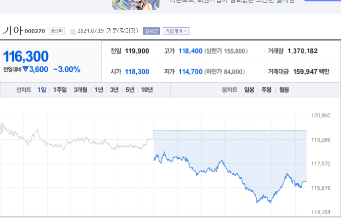 기아 주가는 현재 116,300원이며 전일 대비 -3,600원 하락했습니다. 현재 기아의 대주주는 현대자동차(외 4인)로, 지분은 36.11%입니다. 기아는 자동차 기업으로 시가총액은 46조5035억 원이며 발행 주식수는 399,858,417주입니다. 외국인 보유 비중은 41.60%이며 장중 거래량은 1,498,610주를 기록했습니다. 또한, 기아의 매출액은 262,129억 원입니다.